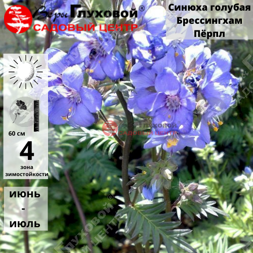 Синюха голубая Брессингхам Пёрпл - , растение с прямостоящими стеблями фиолетового цвета листья зеленые в прохладную погоду приобретают темно-пурпурный оттенок, цветет в июне-июле голубыми колокольчиками. К почвам не особо требовательна, но предпочитает плодородные заболоченные почвы. Высаживают в Альпийские горки, ракарий, цветник, одиночные и групповые посадки, хорошо смотрится с хвойными. Морозостойкость -40С.