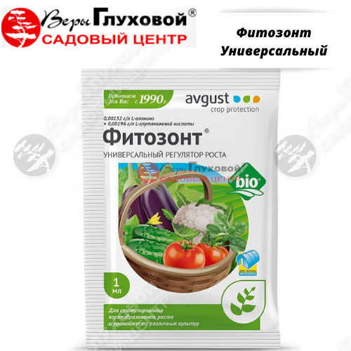 Природный регулятор роста растений. Применяется для повышения энергии прорастания, стимулирования корнеобразования, всхожести, ранней общей урожайности и даже устойчивости к заболеваниям. Показания к применению Фитозонта Универсального включают в себя более 25 культур! От цветов до картофеля, от малины до яблони, от горошины до кочана капусты! Применение этой новинки будет на пользу любой культурному и декоративному растению. Фитозонт Универсальный подходит для обработки всех растений от стадии семян до сбора урожая. Методика применения: замачивание семян, клубней (картофеля), луковиц (лука и луковичных цветов), черенков (декоративных и плодовых деревьев, ягодных кустарников), корневой системы перед посевом и посадкой; полив почвы под растениями; опрыскивание по листовой массе.