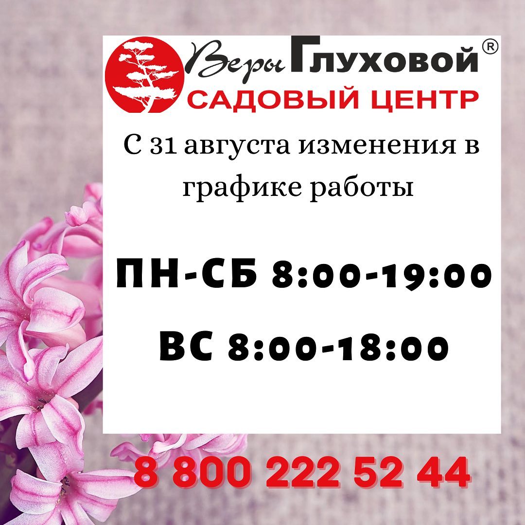 В связи с сокращением светового дня с 31 августа мы меняется режим работы на всех площадках «Садового центра Веры Глуховой».