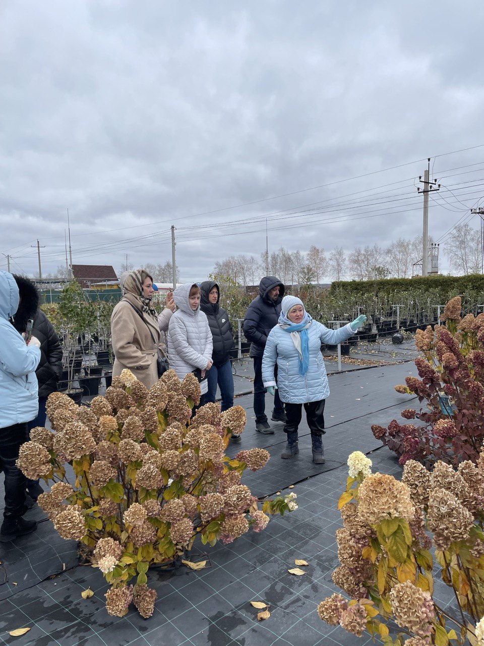 Вера Викторовна поделилась своим опытом, рассказала о жизни предприятия, о том, как происходит выращивание гортензий и продемонстрировала участникам, как каждое растение готовится ко встрече с зимой.